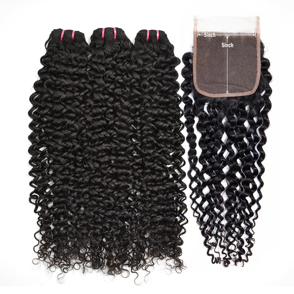 | Hair Bundles | Raw Hair Curly Bundles With Closure 100% Unprocessed Human Hair 3 Bundles Curly With 5*5 HD Lace Closure |