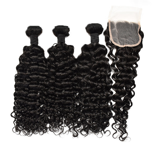 | Hair Bundles | Water Wave Bundles With Closure 100% Unprocessed Human Hair 3 Bundles Water Wave With 4*4 Free Lace Closure |